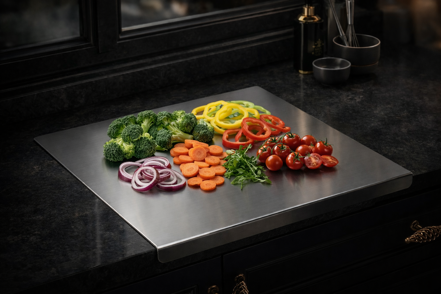 Stainless steel cutting board upgrade your kitchen with a sleek and hygienic chopping board that’s built to last. Perfect for all kinds of food prep, from veggies to meat!